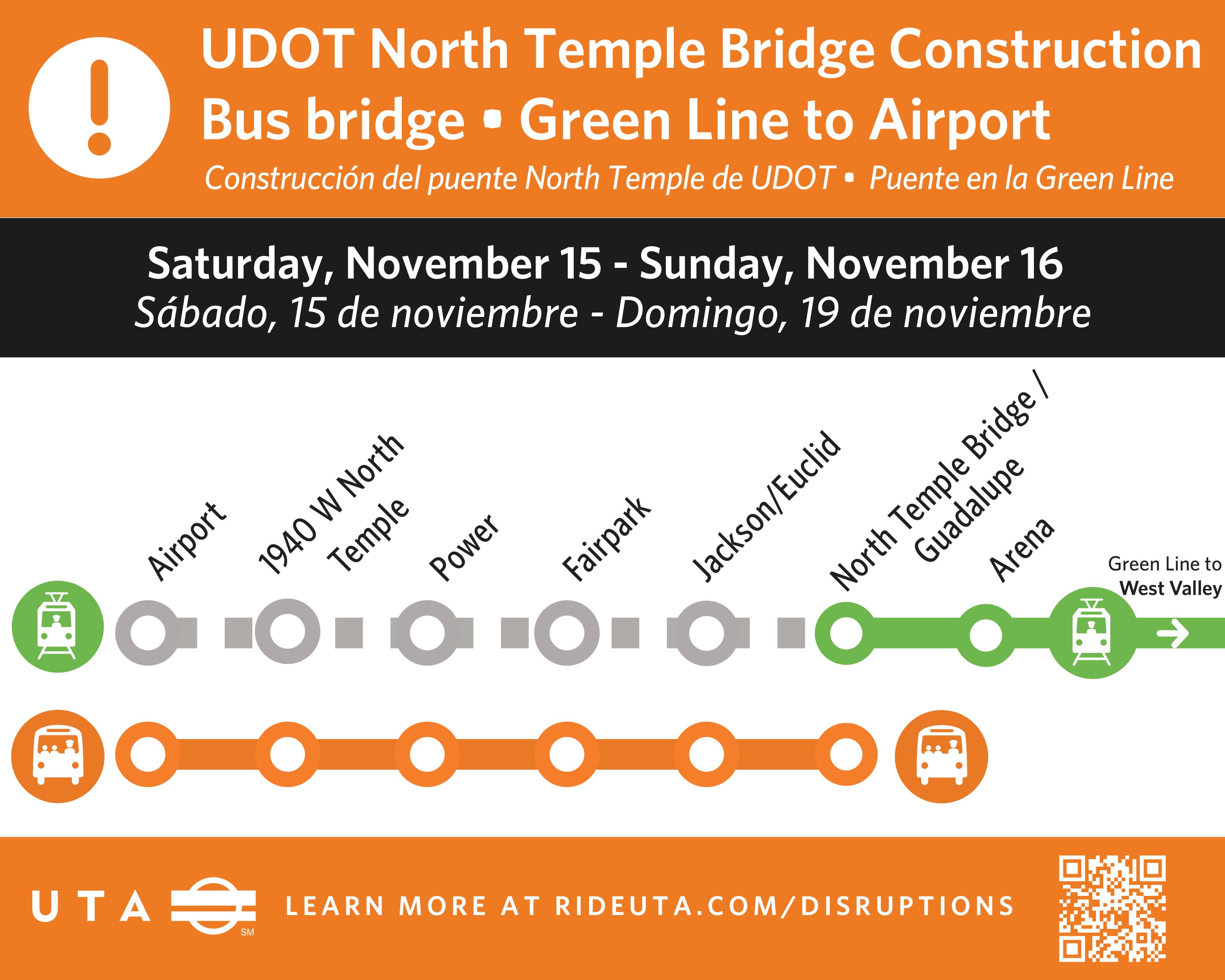 From Saturday, November 15, through the early morning hours of Monday, November 17, UDOT will perform construction on the I-215 Bridge over North Temple. This construction will block UTA TRAX Green Line trains between the Airport Station and North Temple Bridge/Guadalupe Station.